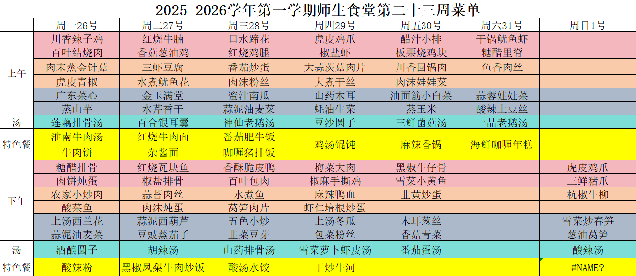 2025-2026学年第一学期师生食堂第二十三周菜单